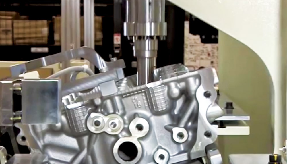 自動車部品のシリンダヘッドのバルブシートとバルブガイドを上下同時圧入する設備です。 従来の3工程の大型設備を、1工程の小型設備に。圧入波形をモニターする事で後工程に不良を流しません。片側のユニットが圧入している時は、もう片側のユニットはパーツを供給し、絶えず動いている正味率の高い設備です。サイズもグローバル展開を見据え、コンテナサイズに納まるコンパクトな設備となっております。 |